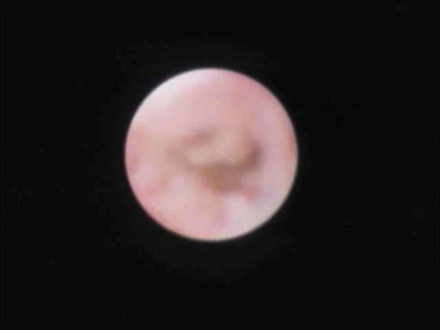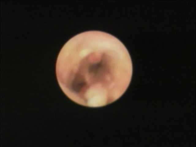 Meme kanserinin süt kanalı içinden duktoskopi görüntüsü (süt kanalının duvar yapısı kanser nedeniyle bozulmuş)