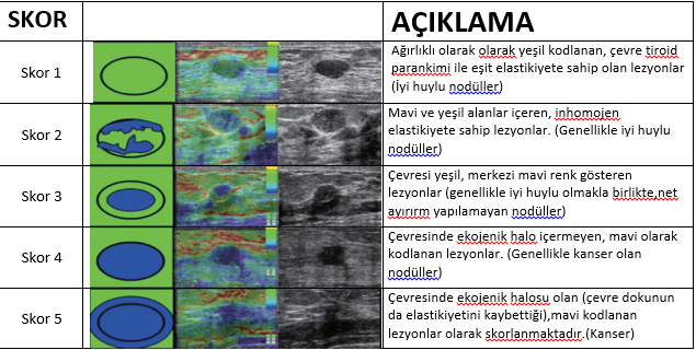 Elastografi görüntüsünde nodüller sertlik derecesine göre 5 gruba ayrılmaktadır. En yumuşak nodüller skor1, olarak sınıflandırılıp renkleri yeşil olurken, sertlik derecesi arttıkça skor yükselip renk maviye doğru değişim gösterip en sert nodüller skor5 olarak sınıflandırılıp renkleri mavi olmaktadır.